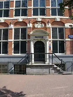 The interior is well preserved because the building never had any other owner than the brokers' guild. The voorhuis (front part of the house), with its checkered black-and-white marble floor, is considered the best-preserved in Amsterdam.[2] The 18th-century fireplace in the guild director's chamber has been preserved, with a mantelpiece dating to 1760. The fireplace also features a painting by Philips Vingboons showing the Amsterdam bourse, the Koopmansbeurs. The walls are decorated with the coat-of-arms of guild directors.