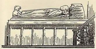 • Æthelstan, regarded as the first king of England. He was buried in the tower, under the altar of St. Mary.[36] According to William of Malmesbury, Æthelstan's body was disinterred in the 11th century and reburied in the abbot's garden (now Abbey House Gardens) to avoid Norman desecration. He is commemorated by an empty 15th-century tomb in the north aisle.[37]