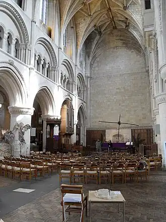 The current Abbey was substantially completed by 1180. The 431 feet (131 m) tall spire, and the tower it was built upon, collapsed in a storm around 1500 destroying much of the church, including two-thirds of the nave and the transept.