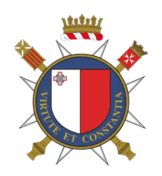 (iv)          The finial of the other mace (the sinister or right as you look at the Arms) represents the Principality and Fortress of Malta, the seat of the Order of St. John of Jerusalem, which defended Malta. The mural crown represents Fortress Malta.