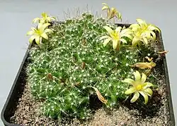 Mammillaria surculosa is a species of flowering plant in the cactus family Cactaceae, native to north eastern Mexico, where it occurs in extremely isolated patches at altitudes of 950–1,200 m (3,120–3,940 ft).[4] It is registered as "Endangered" by the IUCN Red List.[1] Growing to 10 cm (3.9 in) tall by 50 cm (20 in) wide, this tiny plant forms colonies of spiny stems with relatively large, lemon yellow flowers in spring.