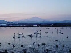 Pond in Nonomura neighborhood of Mamurogawa with Mount Chōkai in the distance