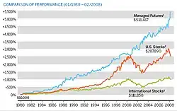 Managed futures have historically displayed very low correlations to traditional investments, such as stocks and bonds.[12] Following modern portfolio theory, this lack of correlation builds the robustness of the portfolio, reducing portfolio volatility and risk, without significant negative impacts on return. This lack of correlation stems from the fact that markets tend to "trend" the best during more volatile periods, and periods in which markets decline tend to be the most volatile.[4] From 1980 to 2010, the compound average annual return for managed futures was 14.52%, as measured by the CASAM CISDM CTA Equal Weighted Index, while the return for U.S. stocks was 7.04% (based on the S&P 500 total return index).[13] However, managed futures also have high fees. According to data filed with the U.S. Securities and Exchange Commission and compiled by Bloomberg, 89% of the $11.51 billion of gains in 63 managed-futures funds went to fees, commissions and expenses during the decade from Jan. 1, 2003, to Dec. 31, 2012.[14]