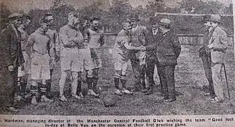 The team was formed in 1928 by Manchester City director, John Ayrton and the owner of Belle Vue motorcycle Speedway, John Iles. Ayrton created Manchester Central because he felt East Manchester needed a League side.[1] City had moved out of the area in 1923, but had initially considered moving to Belle Vue.[2]