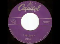 "Mandolino" was composed by Les Paul and was released on Capitol Records as a 7" vinyl 45 single as F2928 45-12972 and published by the Iris-Trojan Music Corporation in New York.[1] The single was also released as a 10" 78 single.[2] The B side was "Whither Thou Goest" featuring Mary Ford on vocals. "Mandolino" reached no. 19 on the Billboard pop singles chart for the week ending on November 17, 1954.[3] The single reached no. 22 on the Cash Box pop singles chart. The single reached no. 33 on the Record World pop singles chart the same year.