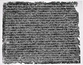 The Mandsaur stone inscription of Yashodharman-Vishnuvardhana, is a Sanskrit inscription in the Gupta script dated to about 532 CE, on a slate stone measuring about 2 feet broad, 1.5 feet high and 2.5 inches thick found in the Malwa region of India, now a large part of the southwestern Madhya Pradesh.[1] On the back are engraved a sign of sun and moon, as well as two horsemen.[1] The inscription opens with the sign for siddham, is entirely in verse of various meters, and is signed at the end with the name of the engraver. The script says Fleet belongs to the "northern class of alphabet", and opens with invocations to Hindu god Shiva.[1]