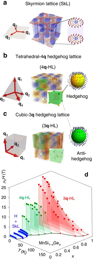 Experimental phase diagram of MnSi1−xGex alloys, revealing magnetic skyrmion, tetrahedral and cubic hedgehog spin arrangements at different compositions x.