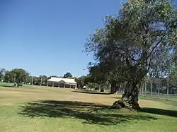View of Manners Hill Park showing the pavilion, peppermint trees and a tennis court
