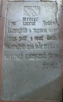 - "MCCCXC. Hic jacent Joh(ann)es Baunfeld et Agnes uxor eius, pat(er) et mat(er) Will(ielm)i Baunfeld, qui ha(n)c eccl(es)ia(m) et maxima(m) campana(m) fieri fecer(u)nt" ("1390. Here lie John Bampfield and Agnes his wife, the father and mother of William Bampfield, who caused to come into being this church and the greatest bell"). The arms are Bampfield impaling Pederton: Argent, a bend gules between three lion's heads erased and ducally crowned sable.[23]