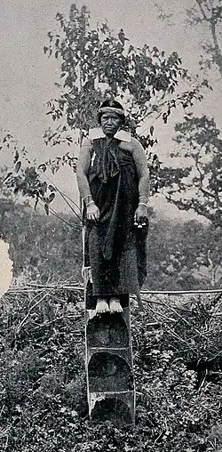 A machi standing on their rewe, the timber structure they climb onto while in a trance-state