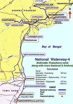 Marakkanam was connected to Vijayawada in Andhra Pradesh through the Buckingham Canal, a 420 km long fresh water navigation canal. The 110-km stretch from Marakkanam to Chennai is called South Buckingham Canal. The canal connects most of the natural backwaters along the coast to the port of Chennai (Madras). It was constructed by the British Raj, and was an important waterway during the late nineteenth and the twentieth century. Canal was formerly used to convey goods up and down, but later the usage has downgraded due to industrial pollution of water.