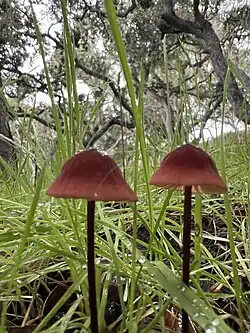 The cap is mahogany with a velvety texture and up to 4 centimetres (1+1โ„2 in) wide.[1][2] The gills are adnate, widely spaced, and pallid to pinkish. The stipe is dark, smooth, up to 13 cm (5 in) long and 3 mm (1โ„8 in) thick.[1][2][3] The spore print is white.[2] It is too tough and thin for consideration as edible.[2]