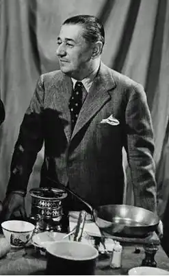 Boulestin was the first regular television chef, broadcasting for the BBC in television's earliest experimental days in 1937–1939.[1] In his programmes, including the 1937 Cook's Night Out,[27] he demonstrated not only French dishes such as Escalope de Veau Choisy,[28] Crêpes d'été,[29] and Rouget Marseillaise,[30] but also deceptively simple food including salads, lamb kebabs, spring vegetables, and picnics.[31]