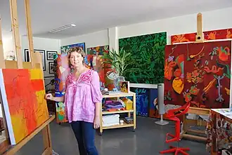 Her professional art production began with etchings while still in Cancun, moving into her primary mode of painting in 1991 after moving to Mexico City.[4] However, her work still includes etching and has expanded to include ceramics, photography, interior design, drawing the human figure, painting Talavera and serigraphy.[1][7] Her preference is to work with acrylics as they allow her to trace outlines easily, dry rapidly, are odorless and do not pollute.[4][16] She does not make preliminary sketches before painting, with the only preliminary work being the tracing of lines on the canvas to assure balance in the composition.[3][17]