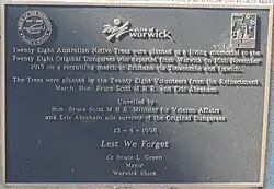In April 1998, a re-enactment March of the Dungarees left Warwick on 13 April to arrive as part of the Anzac Day march in Brisbane on 25 April.[32] Warwick Shire Council celebrated the occasion by planting an avenue of 28 native Australian trees to commemorate the 28 original "dungarees" who departed from Warwick on 16 November 1915. A plaque was unveiled on 13 April 1998 by Bruce Scott, Minister for Veteran Affairs and Eric Abraham (Queensland's last surviving recruit from the March of the Dungarees).