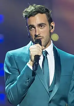 Marco Mengoni (Italian: [ˈmarko meŋˈɡoːni]; born 25 December 1988) is an Italian singer-songwriter who rose to fame in 2009, after winning the third season of Italian talent show X Factor.[1] Since then he has sold over 2.8 million records in Italy, peaking the Italian albums chart seven consecutive times and entering the Top 10 Italian Singles Chart fifteen times.[2][3] He won the Sanremo Music Festival in 2013 and again in 2023, therefore representing Italy in the Eurovision Song Contest in both years.