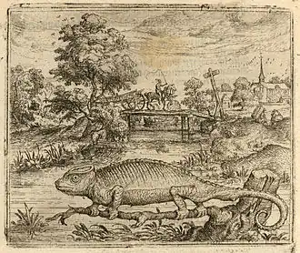 The principal source of the text in the book were Les fables du très ancien Ésope written by the French humanist Gilles Corrozet and published in Paris in 1542. A second source was the Aesopi Phrygis et aliorum fabulae, a collection of fables in Latin that was published on the Antwerp printing presses of Christophe Plantin in various editions from 1660. A third source for the fables writings of natural history such as Der Naturen Bloeme (The Flower (i.e. choice) of Nature), a Middle Dutch natural history encyclopedia, written in the thirteenth century by the Flemish writer Jacob van Maerlant and the Dutch-language natural history compilation Der Dieren Palleys (The palace of the Animals), published in Antwerp in 1520. A final source for the fables are contemporary emblemata books such as the Emblemata of Andrea Alciato and an emblem of Joannes Sambucus.[15] Illustrations made by Bernard Salomon for an edition of Aesop's fables published in Lyon in 1547 and a German edition with prints by Virgil Solis published in Frankfurt in 1566 were the basis for the motifs of Gheeraerts. He gave his subjects greater naturalism than these artists. About 30 images were Gheeraerts' own invention.[16]