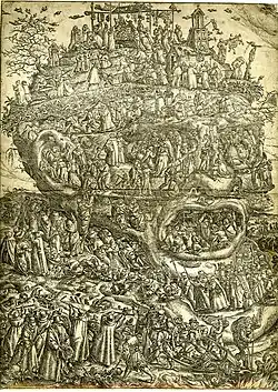 Marcus Gheeraerts became involved in the Calvinist community in Bruges and became a leader of the local church community. Whereas Calvinism was initially tolerated, the religious persecution of Calvinists commenced in 1567 with the arrival of new governor of the Low Countries, the Duke of Alva. In 1566 he participated in protests against the arrest of Calvinists in Bruges. He reflected in his art on the religious turmoil and iconoclasm of his time. As a Calvinist and artist he seemed to have had mixed feelings about the Iconoclasm of his religious group: he condemned idolatry of images but did not agree with the wholesale destruction of religious images by the Iconoclasts. In 1566 or shortly after, he created a print referred to as the Allegory of Iconoclasm that shows a composite rotting head of a monk. The head appears to rise up from a rocky outcropping. Myriad little figures swarm over the rocks. They enact 22 different scenes that used to be denoted by alphabetical keys which have not survived.[7] Inside the gaping mouth a diabolical mass is celebrated. On the pâté of the head sits a pope-like figure under a canopy on a throne surrounded by bishops and monks. Indulgences and rosaries are pinned up on the staves and various rituals and processions take place and are labelled with letters. In the foreground Protestant iconoclasts are smashing altarpieces, religious sculptures, other church-related items and hurling them into a fire.[8][9] The print is a condemnation of Catholic idolatry in all its forms and shows the Calvinists as cleansing the world of this perceived evil.[7] Gheeraerts is believed to have followed up this print with more politically tainted prints, which resulted in 1568 in a prosecution for producing caricatures of the pope, the king and Catholicism.[4]