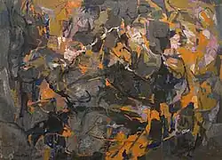 In the 1960s Tomkins, having shifted from tempera to oil painting,[3] created the pure Abstract style for which she remains best-known today. Transformation and metamorphosis were common themes, with forms shape-shifting across her canvases, twisting and intertwining with or obscuring each other. She generally used a limited palette of grays, whites, and earth tones, with occasional flashes of red, blue, and yellow, developing an intricate symbolic language to express social and environmental concerns or reflect on personal experiences.[1]