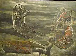 During the Second World War, while FitzGerald worked at Boeing, Tomkins gave birth to the first of their three children. She supplemented their income with ceramic works, and began working with egg tempera while sketching out new directions for her painting.[3] In addition to painting, Tomkins and FitzGerald were both fine craftsmen and sculptors, working in ceramics and even furniture design. Their Modernist ceramics were mostly utilitarian objects such as bowls, vessels and lamps, done in a unique and imaginative style.[4] Works by Tomkins appeared in several annual shows at the Whitney in New York and the Corcoran Gallery in Washington, D.C., and in 1947 three of her pieces were selected for inclusion in the Abstract and Surrealist American Art exhibit at the Chicago Art Institute. That same year, a one-person show of twenty-three of her paintings was mounted at the Palace of the Legion of Honor in San Francisco alongside a solo exhibition of prints by surrealist artist Roderick Mead;[5] these works were also shown at the Seattle Art Museum.[3] At this time, with only a handful of small galleries (such as Zoe Dusanne's and Otto Seligman's) showing modern art in Seattle, Tomkins was looking beyond the confines of the Northwest for both inspiration and reaction.