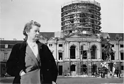 Margarete Kühn in front of Charlottenburg Palace during reconstruction, 1953