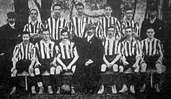 Margate Football Club was founded in 1896 as an amateur club and was originally called Margate Town,[4] playing friendly matches on local school grounds.[5] In the years before the First World War the club played in several different amateur leagues, with little success, and played at various grounds in the Margate area,[4] before settling on a pitch at what would later become the Dreamland amusement park in 1912.[6] This ground became known as the Hall-by-the-Sea Ground,[4] taking its name from a local dance hall.[7]