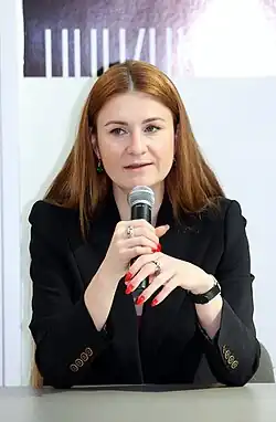 Maria Valerievna Butina[a] (Russian: Мари́я Вале́рьевна Бу́тина; born 10 November 1988) is a Russian politician, political activist, journalist, and former entrepreneur who was convicted in 2018 of acting as an unregistered foreign agent of Russia within the United States.[1][2][3]