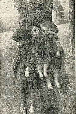 Unable to receive help from the local Romani and Polish communities, the 32-year-old woman wandered with her children in the freezing swamps between the villages of Antoniówka, Dąbrowa Kozłowska and Siczki.[2] Dolińska, who was mentally ill, decided that the only way to protect her children from starvation was to end their lives. On 11 December 1923 at around 8 p.m. she killed Zofia (6 months), Antoni (3 years), Bronisława (5 years) and Stefan (7 years) and tied them to a tree.[2] The next day she went to the police station in Radom and confessed to the crime. Dolińska was placed under arrest following an on-site investigation. A police photographer took several photographs of the hanged children.[2]