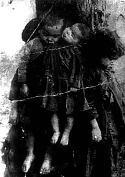One of the photographs includes lines crossing the image, probably from folding of the developed print or scratches on the negative. Within the context of the Volhynian massacre narrative, these lines were wrongly interpreted to be barbed wire securing the children to the tree.[1] In a 2019 article in the Polish academic journal Widok, Sara Herczyńska writes that the photograph "proved a perfect fit for the perpetrator-oriented discourse on the Volhynian genocide" and that its ubiquity could be explained as driven by the public's need to have a visual representation of the savagery of the massacres.[1]