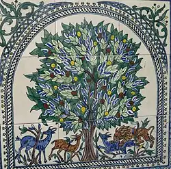 Her contribution to Middle Eastern art was to introduce more Armenian elements, such as trees, animals and birds in a primitive style and elevate the craft to fine art and therewith brought her own cachet. She added movement to what had traditionally been static compositions and reminded us of the glorious beauty of nature. Suddenly, gazelles were prancing, peacocks were preening, garlands were flowing. The concept known as the Gardens and Views of Paradise of Marie Balian developed. She referred to 13th century after Christ when Persian artists were favoring garden scenes for their painted ceramic tiles. Symmetry gave way to dynamic asymmetry. At a later age she herself becomes aware she is a link in an ancient chain, and that she has played a crucial role in rescuing one branch of a centuries-old tradition from oblivion. "It's very easy for me. It's as if I had already done this in an earlier age, like the fourth, fifth or sixth century." She became the master painter of the Balian atelier[3] in East Jerusalem, the Palestinian Pottery and a renowned artist.[4]