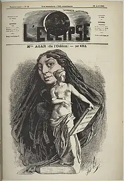 Marie Léonide Charvin was a French theater actress, better known by her stage name Agar. She was born in Sedan on September 18, 1832, and died on August 15, 1891, to Sidi M'Hamed in Algeria. She starred in some of the most famous French Plays of the 19the Century such as Cinna by Pierre Corneille, Athalie, Phèdre, Andromaque and Britannicus by Jean Racine and Le Passant by François Coppée. She also worked with some of the most famous actresses of their time such as Rachel Félix and Sarah Bernhardt. Upon her death Pauline Savari said "Above all in love with the great heroines, in turn Camille, Phèdre, Hermione and Emilie, she did not lavish her admirable talent in numerous and fleeting creations; but if it had only the two roles of the passer-by, that touching inspiration of François Coppée, and of the enemy mothers, the master and powerful work of Catulle Mendès! That would already be glory!" Marie Léonide Charvin is known as one of the most famous actresses of the late 19th century.[1]