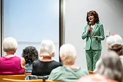 Newman speaks at an author conversation at the Oak Park Public Library in 2025.