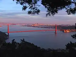 The Marin Headlands are a hilly peninsula at the southernmost end of Marin County, California, United States, located just north of San Francisco across the Golden Gate Bridge, which connects the two counties and peninsulas. The entire area is part of the Golden Gate National Recreation Area. The Headlands are famous for their views of the Bay Area, especially of the Golden Gate Bridge.