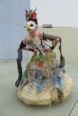 Marina DeBris is the name used by an Australian-based artist whose work focuses on reusing trash[1] to raise awareness of ocean and beach pollution.[2][3][4][5] DeBris, who is one of the longest standing practitioners of trashion, uses trash washed up from the beach to create trashion.[6][7] As well as creating art from debris, DeBris also is a fund raiser for environmental organizations,[8][9][10] and collaborates with non-profit organizations and schools to educate children about ocean pollution.[11][12] In 2021, DeBris found almost 300 face masks on beaches, and used them in her trashion and other displays.[13]
