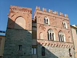 The maritime republics (Italian: repubbliche marinare), also called merchant republics (Italian: repubbliche mercantili), were Italian thalassocratic port cities which, starting from the Middle Ages, enjoyed political autonomy and economic prosperity brought about by their maritime activities. The term, coined during the 19th century, generally refers to four Italian cities, whose coats of arms have been shown since 1947 on the flags of the Italian Navy and the Italian Merchant Navy:[1] Amalfi, Genoa, Pisa, and Venice. In addition to the four best known cities, Ancona,[2][3] Gaeta,[4] Noli,[5][6][7] and, in Dalmatia, Ragusa, are also considered maritime republics; in certain historical periods, they had no secondary importance compared to some of the better known cities.