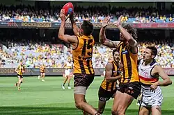 An uncontested overhead mark taken by Luke Hodge in a 2017 AFL game between Hawthorn and Adelaide