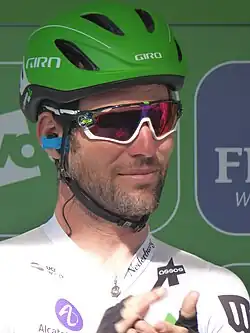 Sir Mark Simon Cavendish KBE (born 21 May 1985) is a Manx retired professional cyclist.[9] As a track cyclist he specialised in the madison, points race, and scratch race disciplines; as a road racer he was a sprinter. He is widely considered one of the greatest road sprinters of all time,[10][11] and in 2021 was called "the greatest sprinter in the history of the Tour and of cycling" by Christian Prudhomme, director of the Tour de France.[12]