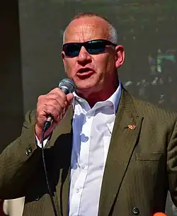 Mark Steele (born 1960)[1] is a British conspiracy theorist who is best known for his videos alleging that 5G, WiFi and other communication networks are part of a distributed weapon system.[2] He lives in Gateshead, England, which is the focus of much of his activism. Steele describes himself as a "weapons expert", claiming to have worked on undisclosed projects for the Ministry of Defence,[3] and studied psychology and social sciences at the Open University.[4]