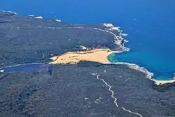 Marley Beach is a southeast-facing beach, approximately 360m in length. Neither swimming nor surfing is advised, with hazards including topographical rips, bluebottle and shark sightings.[1] Rock platforms occupy the southern end of the beach, which has been used by many as a fishing spot. Behind the beach exists an extensive system of sand dunes, occupying over 130,000 square meters. While not as big as the Cronulla sand dunes, the area is still comparable to that of Sydney Cove. Lagoons and channels, running off from Marley Lagoon, run through the sand dunes, acting as a popular swimming spot, alternative to the Marley Beach surf.[4] While the landscape and water flow of the dunes change constantly over time, there is usually a consistent body of water about 150 meters from the shore.[5]