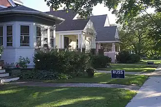 • The Lynch house at 1500 Rutledge St is another 1.5-story bungalow built in 1926, but different in that it is oriented diagonally on a corner lot, and it has a hip roof flared at the eaves above the porch and front wing.[12]