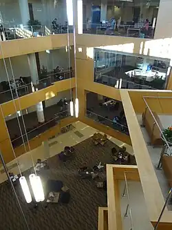 Eckstein Hall is located on the eastern end of the Marquette campus, two blocks from the Milwaukee County Courthouse and a mile from the Federal Courthouse. At 200,000 square feet, the building is four stories tall. It includes a four-story "library without borders,"[15] two mock courtrooms, a four-story atrium (the Zilber Forum), a cafeteria, a workout facility, a conference center, classrooms and faculty offices.[16][17] The classrooms were all designed as "smart classrooms" with projectors, cameras, audio recording, and individual microphones built into classroom seating.[18][19]