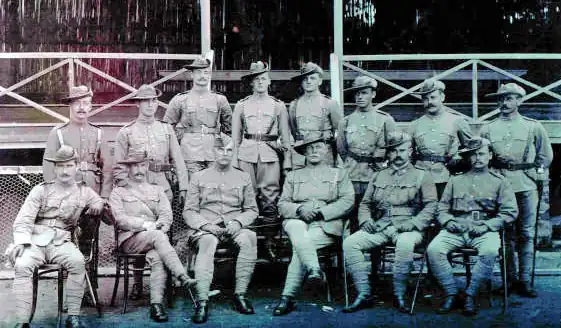 Officers of Marshall's Horse, 1899. Back row of three: Lieut D G Tennant; Capt H B Capstick; Lieut F A Woodcock. Middle row, left: Lieut B L E Jay; Lieut J D Forbes. Middle row, right: Lieut S H Godwin; Lieut F H Nek; Capt H Gethin (killed in action). Front row of 6: Lieut G H Hull; Capt E G Booth; Hon Major H T Tamplin; Capt G Marshall (Officer Commanding); Capt & Adjt F A Saunders, Capt J R MacAndrew.