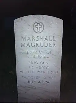 Brigadier General Marshall Magruder (12 October 1885 – 4 July 1956) was born in Washington, D.C. He served in both World War I and World War II. His son was noted aircraft designer Peyton M. Magruder. BG Magruder retired from the US Army in 1946. He was buried at Arlington National Cemetery in Section 30, Site 1092.[1]