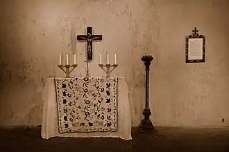 Don Antonio Severino Martinez, also known as Severino Martinez, bought the property about 2 miles southwest of the Taos Plaza in 1804,[3] after relocating his family from Abiquiu to Taos that year.[4][nb 1] At first the building was a four-room dwelling and then it grew as Martinez became more successful.[7] It was made of thick adobe walls, without exterior windows. The hacienda had 2 inner courtyards, or placitas, around which a total of 21 rooms were built. It was constructed as a fortress for protection against attacks by Plains tribes,[3][8][nb 2] such as Comanche and Apache raiders. When there was a threat of violence, the livestock were brought into the courtyards of the hacienda for safety.[10]
