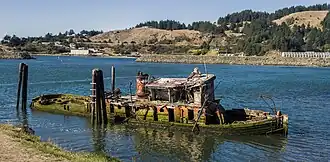 The Mary D. Hume was a steamer built at Gold Beach, Oregon in 1881, by R. D. Hume, a pioneer and early businessman in that area. Gold Beach was then called Ellensburg. The Hume had a long career, first hauling goods between Oregon and San Francisco, then as a whaler in Alaska, as a service vessel in the Alaskan cannery trade, then as a tugboat. She was retired in 1977 and returned to Gold Beach. In 1985 she sank in the Rogue River and has remained there ever since as a derelict vessel on the shoreline. The Hume is listed on the National Register of Historic Places.