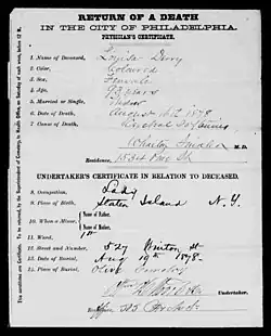 Aaron Burr never acknowledged the fact that he had a relationship or children with Emmons during his lifetime – nor did he mention his children with Emmons in his will, even though he did mention two of his other illegitimate children in it.[9] Additionally, the death certificates of both Louisa Ann and John Pierre both leave the slots for "Mother" and "Father" blank.[10][6] However, according to a descendant of Burr and Emmons, historian Dr. Allen Ballard, Emmons married Burr shortly after his first wife Theodosia's death, which would have legitimized their two children.[2]