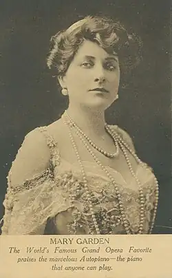 Mary Garden (20 February 1874 – 3 January 1967) was a Scottish-American operatic lyric soprano, then mezzo-soprano, with a substantial career in France and America in the first third of the 20th century. She spent the latter part of her childhood and youth in the United States and eventually became an American citizen, although she lived in France for many years and eventually retired to Scotland, where she spent the last 30 years of her life and died.[1]