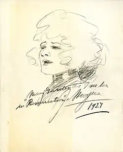 Although serving as director for only one year, she was responsible for producing the world première of Prokofiev's The Love for Three Oranges. Also during this time she appeared in two silent films made by Samuel Goldwyn, the title role in a film version of Thais (1917) and the role of Dolores Fargis in The Splendid Sinner (1918).[10] During World War I she was decorated by the French and Serbian governments and made a Chevalier (knight) of the Légion d'Honneur in 1921.[2]