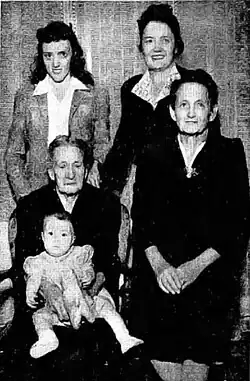 Five generations of Woolsey's family: Vevedeen Hill (back left), Mary Hale Woolsey (back right), Hannah Case Stewart (front left), Elizabeth Evanh (front right), Becky Hill (baby, 7 months old)