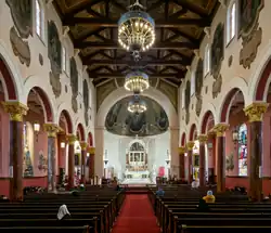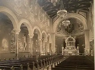The church is designed in the Romanesque style with Italianate features.[29] The church was designed by prominent local church architect Edward T. P. Graham with significant involvement of the pastor, Fr. Danahy. The frescoes in the church's interior, depicting the 12 Apostles in the nave and the Annunciation, the Assumption, and the Coronation of Mary in the apse, were executed in 1910 by Professor Gonippo Raggi of the Pontifical Academy of Fine Arts and Letters of the Virtuosi al Pantheon. The stained glass, which parish oral tradition maintains were also largely designed by Fr. Danahy, are the product of the Franz Xaver Zettler Studios, member of the Royal Bavarian Art Institute for Stained Glass. The church's thirteen large stained glass windows are remarkable examples of the Zettler studio's pioneering use of three point perspective in stained glass, for which the studio was awarded the top prize in stained glass at the 1893 World's Columbian Exposition in Chicago, besting even the work of Louis Comfort Tiffany. The church boasts three altars of white marble, and a communion rail of red marble and copper. The bell tower is 135 feet in height, the exact height of the pinnacle of the Temple of Jerusalem, and houses the three original bells, named for St. Elizabeth, St. John the Baptist, and St. Gabriel. The facade of the church in the Neoclassical style boasts four Corinthian columns, and the gable displays a relief sculpture depicting the apparition of Our Lady of Lourdes.